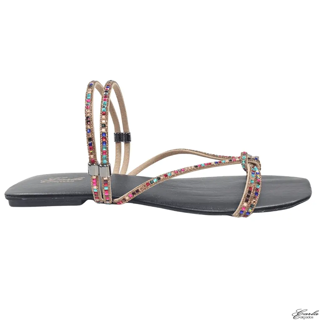 Rasteirinha Preta Pedraria Colorida Strass Tamanho Especial 41 ao 44