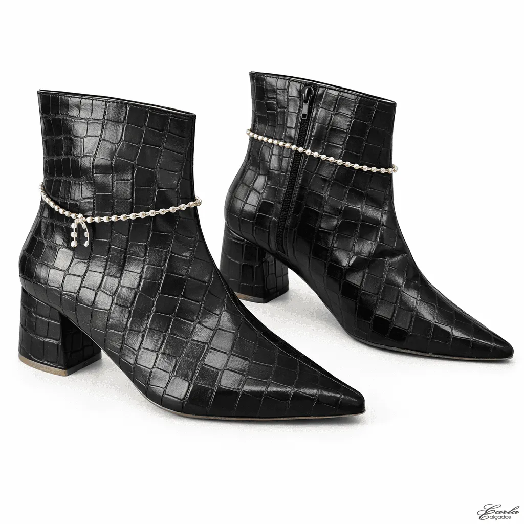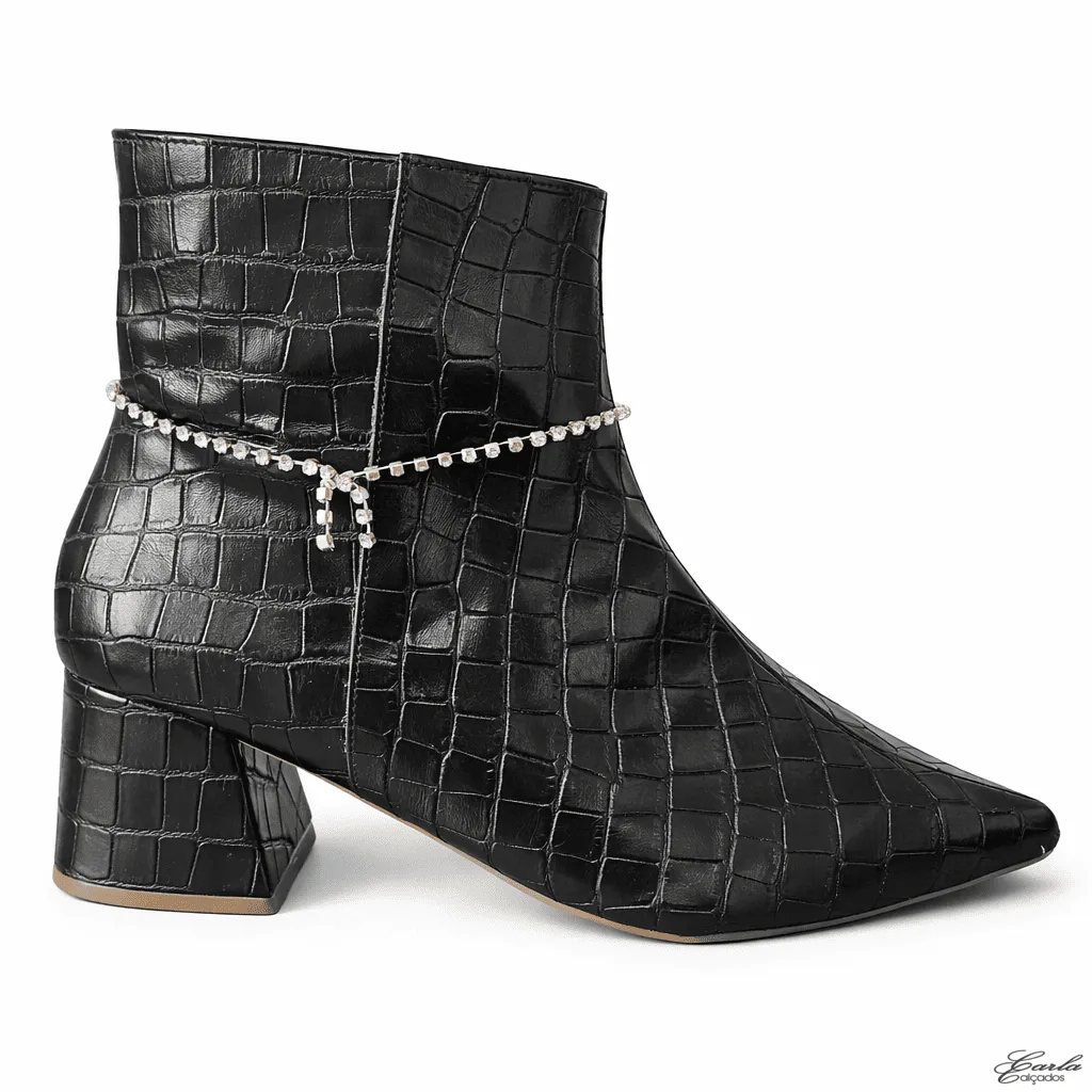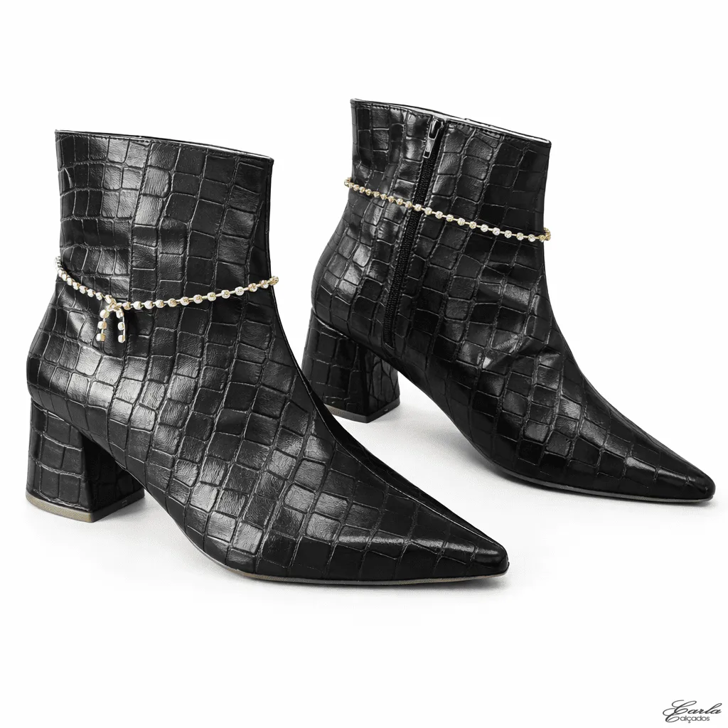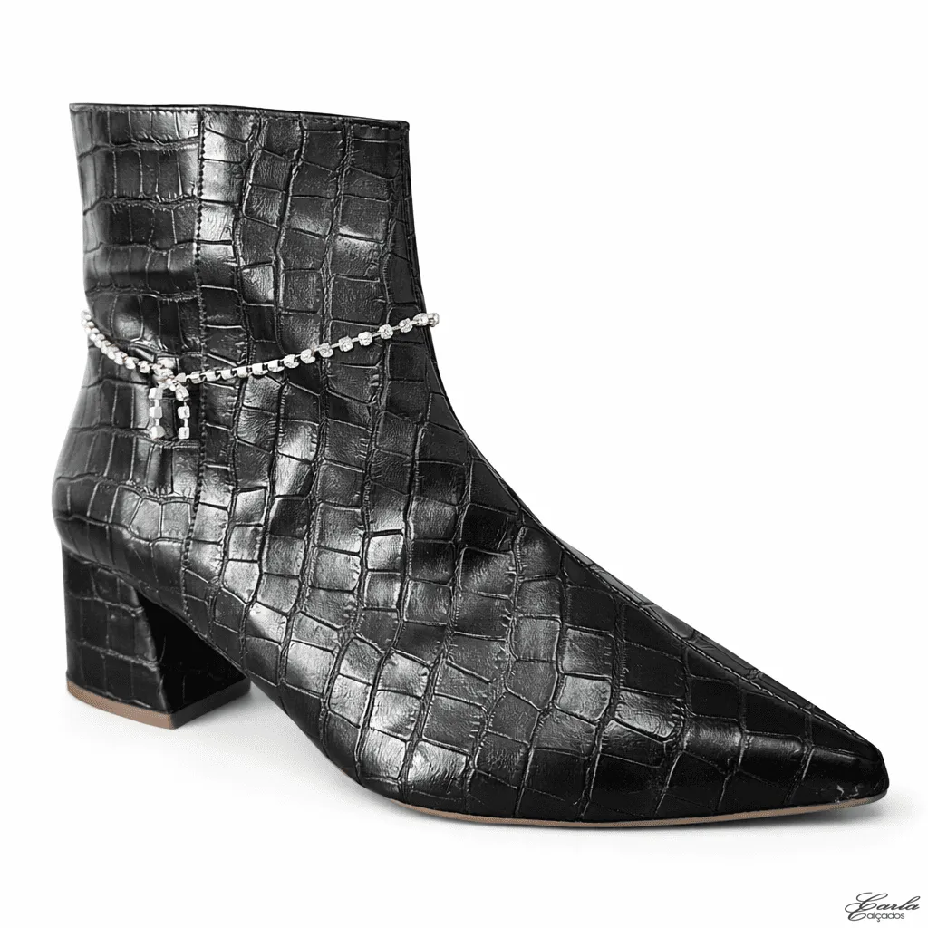 Bota Numeração Especial Preta Croco Corrente Removível Salto Bloco 5cm: Um modelo que transforma qualquer produção.