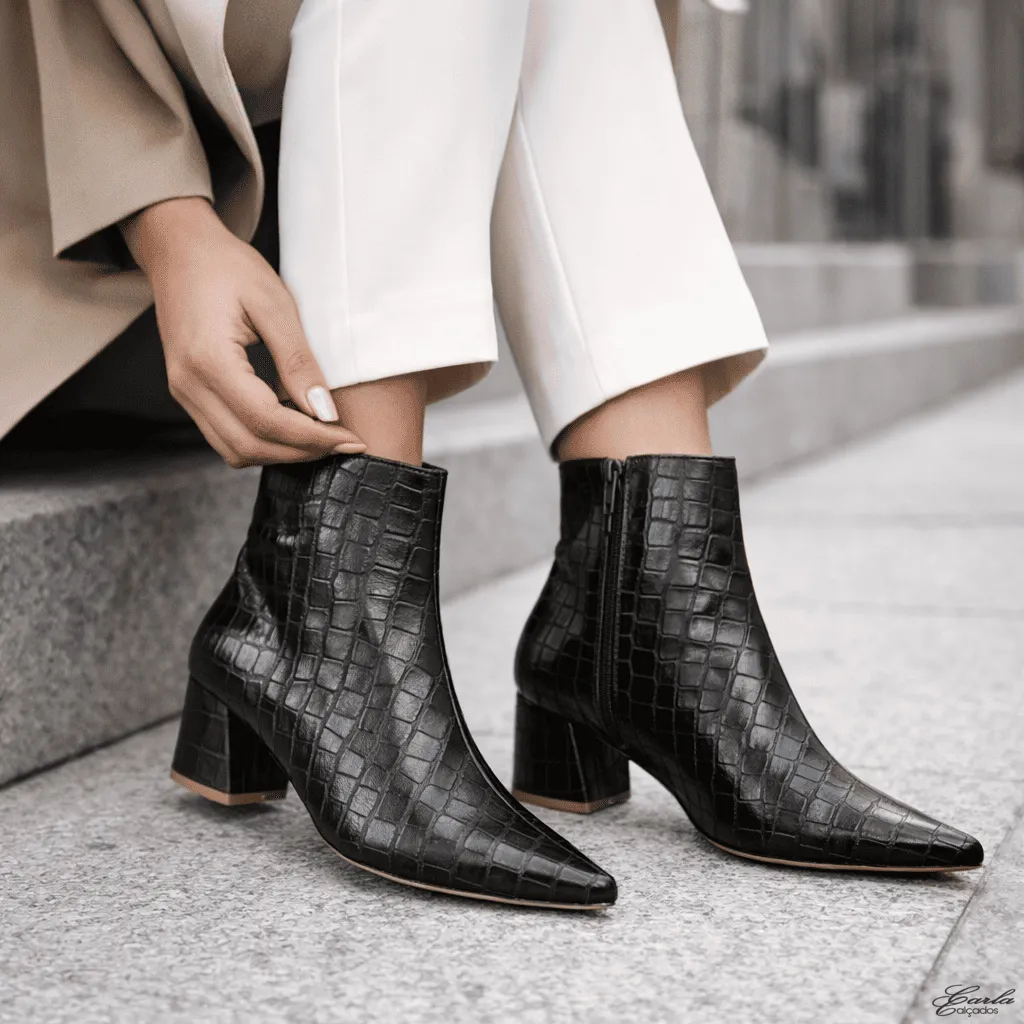 A Bota Preta Croco não é apenas um calçado, é o ponto de destaque do look. O acabamento texturizado traz profundidade e sofisticação, criando um visual marcante sem precisar de esforço.