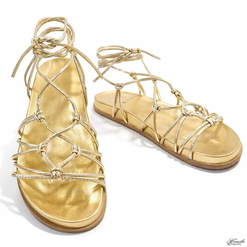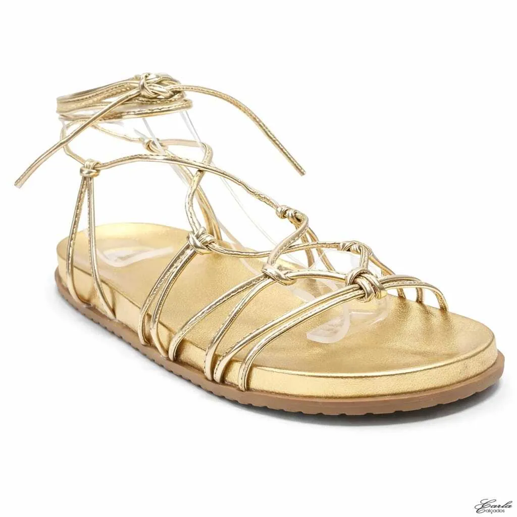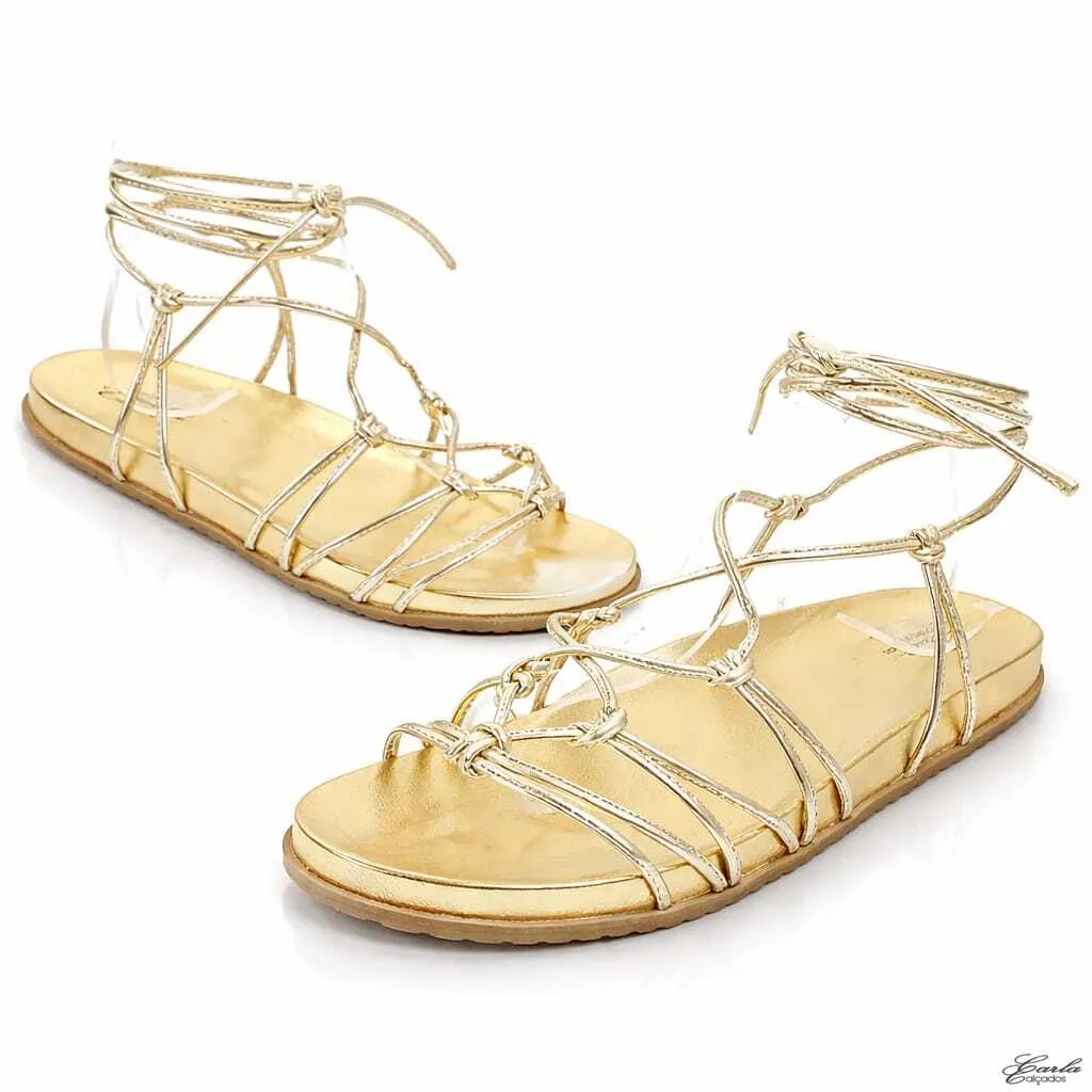 O acabamento dourado metalizado ilumina os pés com elegância, enquanto as tiras finas de amarração abraçam o tornozelo com suavidade, criando um visual moderno, feminino e extremamente sofisticado. Os nós frontais adicionam movimento ao design e destacam ainda mais a beleza do modelo.