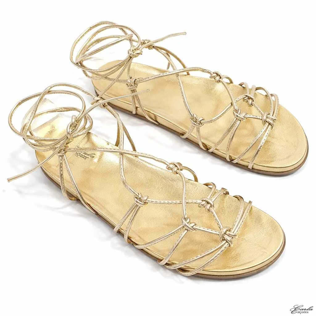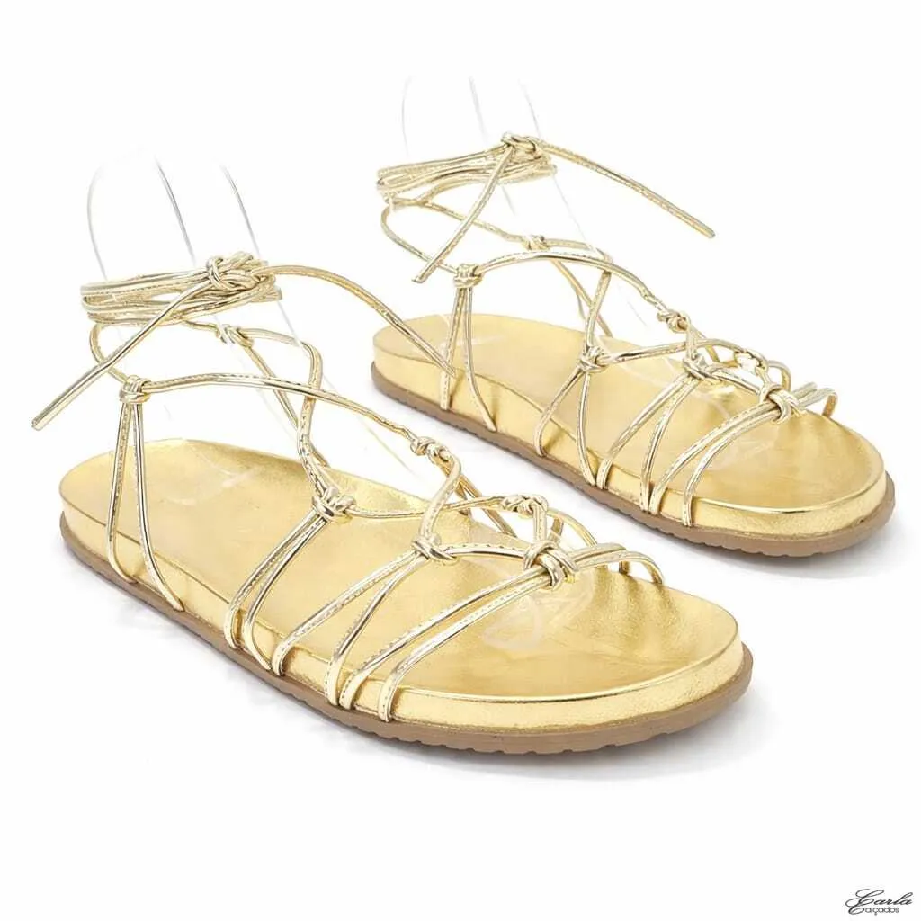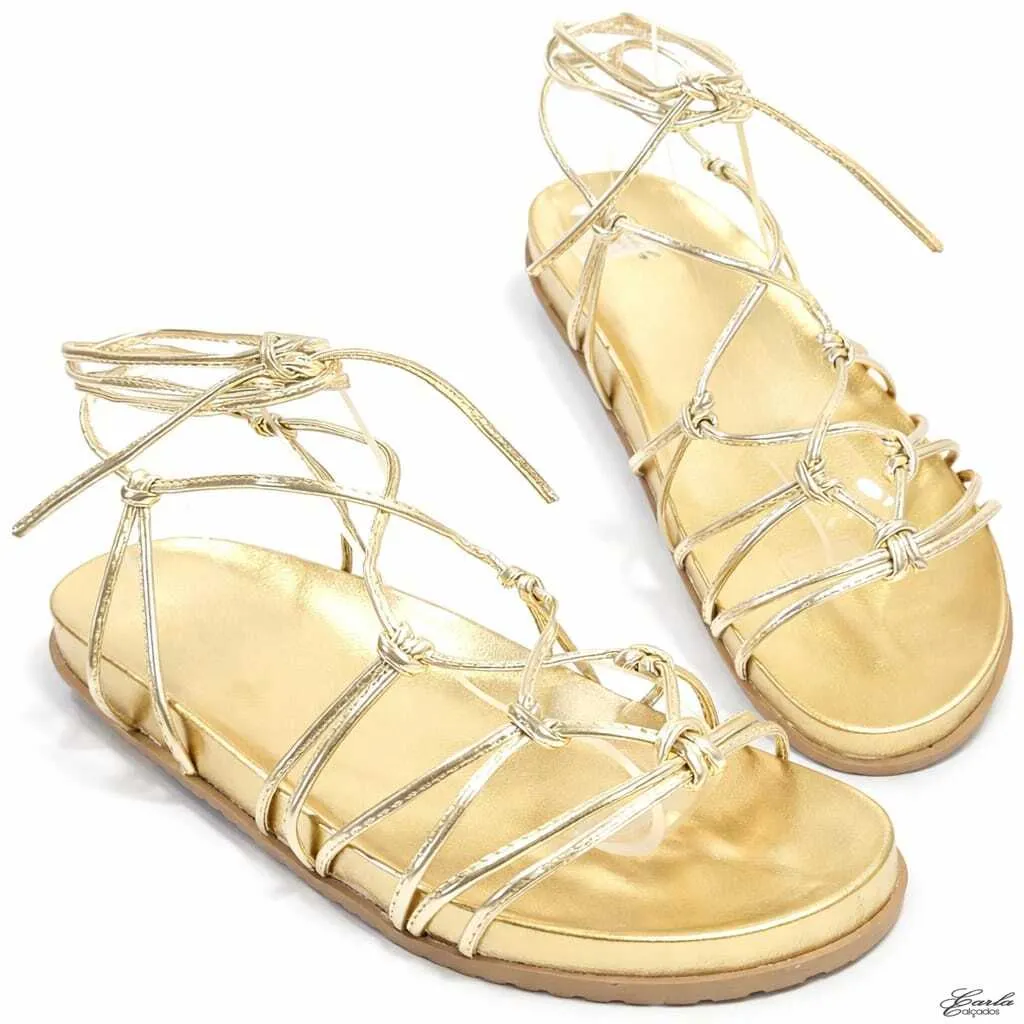 O acabamento dourado metalizado ilumina os pés com elegância, enquanto as tiras finas de amarração abraçam o tornozelo com suavidade, criando um visual moderno, feminino e extremamente sofisticado. Os nós frontais adicionam movimento ao design e destacam ainda mais a beleza do modelo.