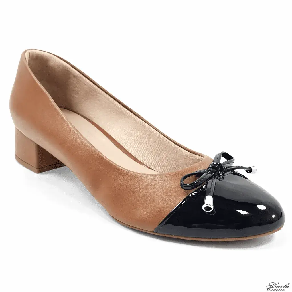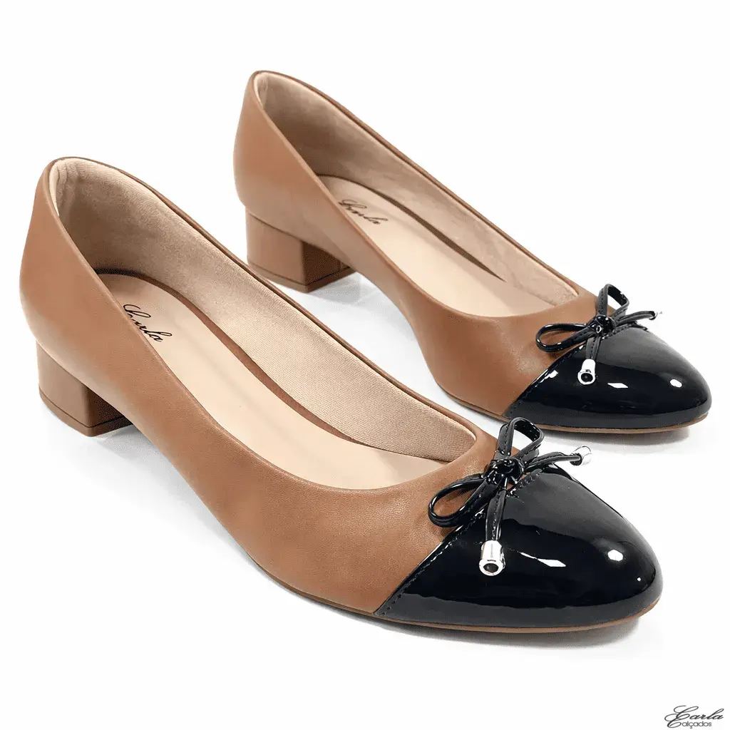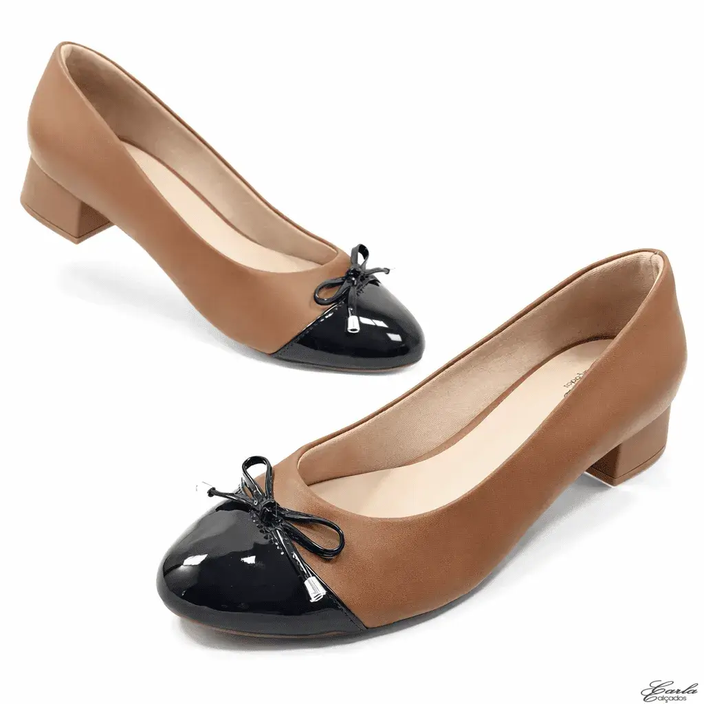 O Peep Toe Salto 5cm Caramelo e Preto Tamanho Especial une elegância clássica e conforto para o dia a dia. A combinação entre o tom caramelo e o bico em verniz preto cria um contraste sofisticado que valoriza o visual e facilita as combinações.
