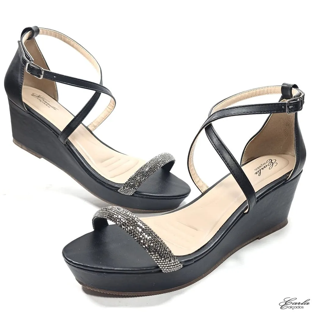 Plataforma Preta Cruzada Strass Tamanho Especial – Sofisticação em Cada Passo, do 41 ao 43