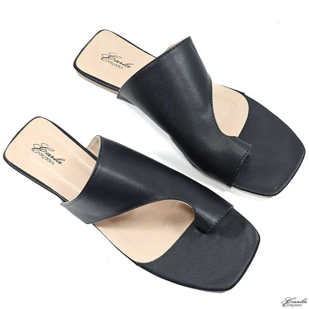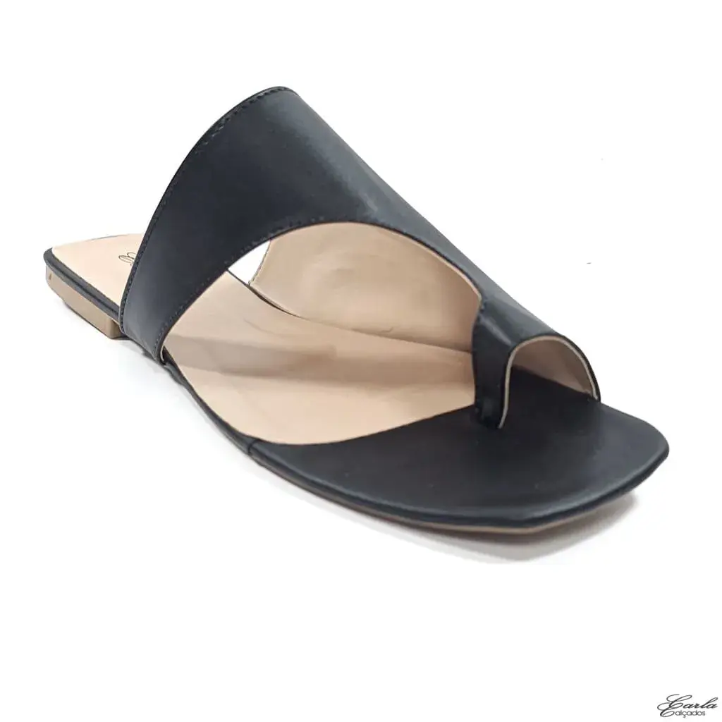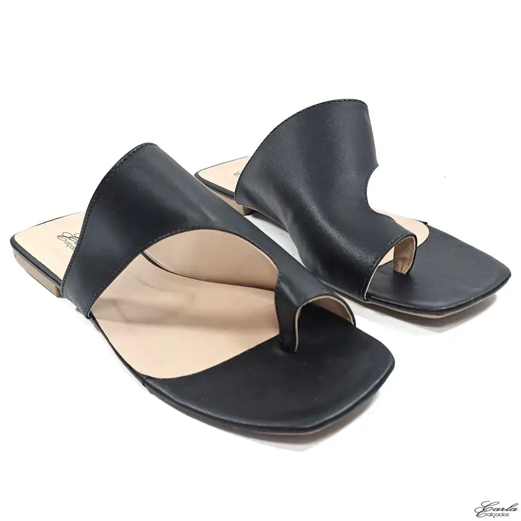 Produzida em material sintético preto, essa rasteirinha apresenta um recorte diferenciado que cobre parte do pé e separa os dedos com suavidade, oferecendo um encaixe anatômico e confortável. Além disso, o modelo segue o estilo mula manca, conhecido por seu calce prático e visual refinado.