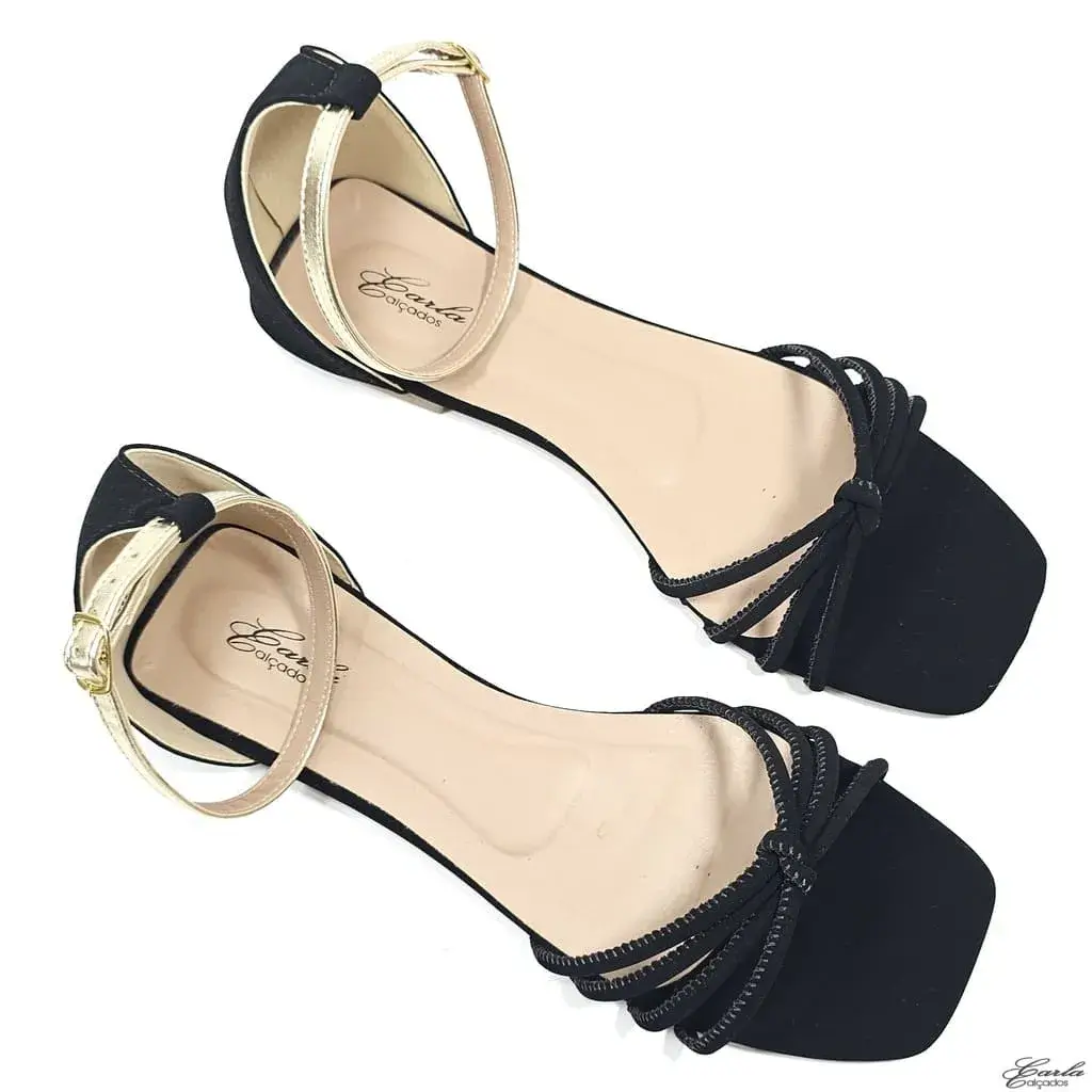 O toque de brilho fica por conta da fivela metalizada dourada, que contrasta com o preto e adiciona um detalhe sofisticado ao visual. Além disso, o calcanhar fechado oferece mais segurança e sustentação, enquanto o bico quadrado traz um ar contemporâneo e estiloso. A sola de borracha completa o conjunto, garantindo leveza, conforto e estabilidade em cada passo.