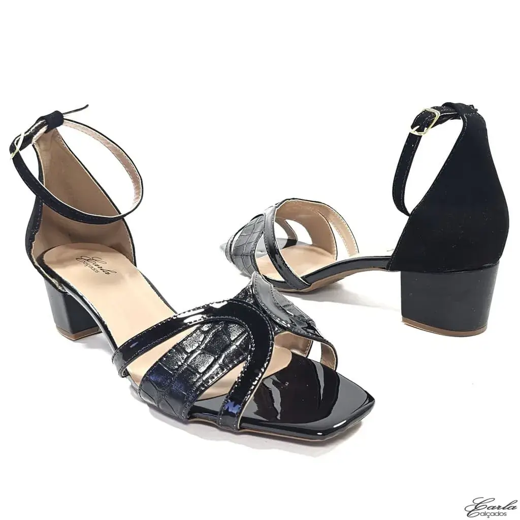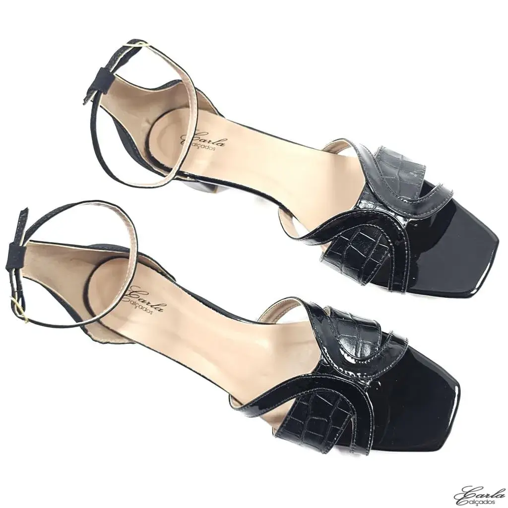 A Sandália Salto 5cm Verniz Preta Croco Tamanho Especial combina elegância, brilho e conforto em um único modelo. O acabamento em verniz destaca o visual sofisticado, enquanto o detalhe croco adiciona textura e personalidade ao design.