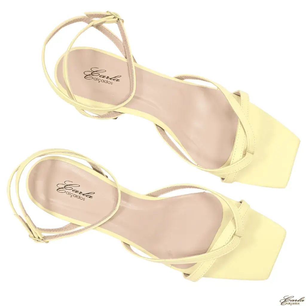 Confeccionada em material sintético amarelo, a sandália amarela apresenta bico quadrado e tiras que cruzam suavemente no tornozelo, garantindo firmeza e, ao mesmo tempo, um visual atual e delicado. Além disso, a fivela regulável permite um ajuste confortável, adaptando-se ao pé com precisão para oferecer mais segurança ao caminhar.