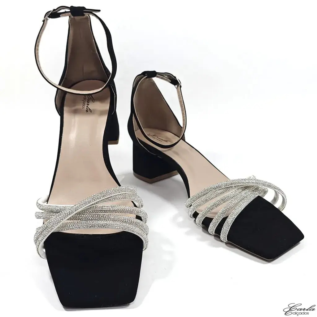 • Sandália Salto 5cm Nobuck Preta Strass Tiras Cruzadas Tamanho Especial