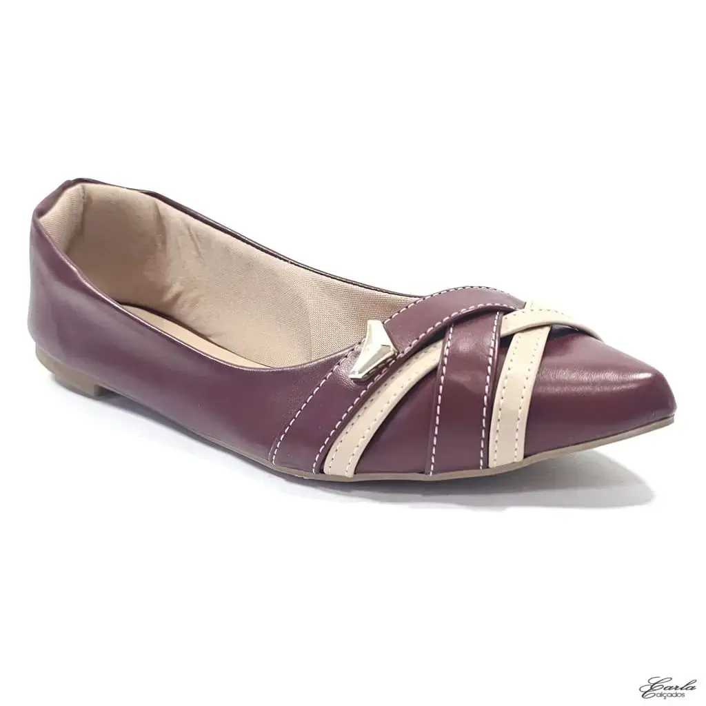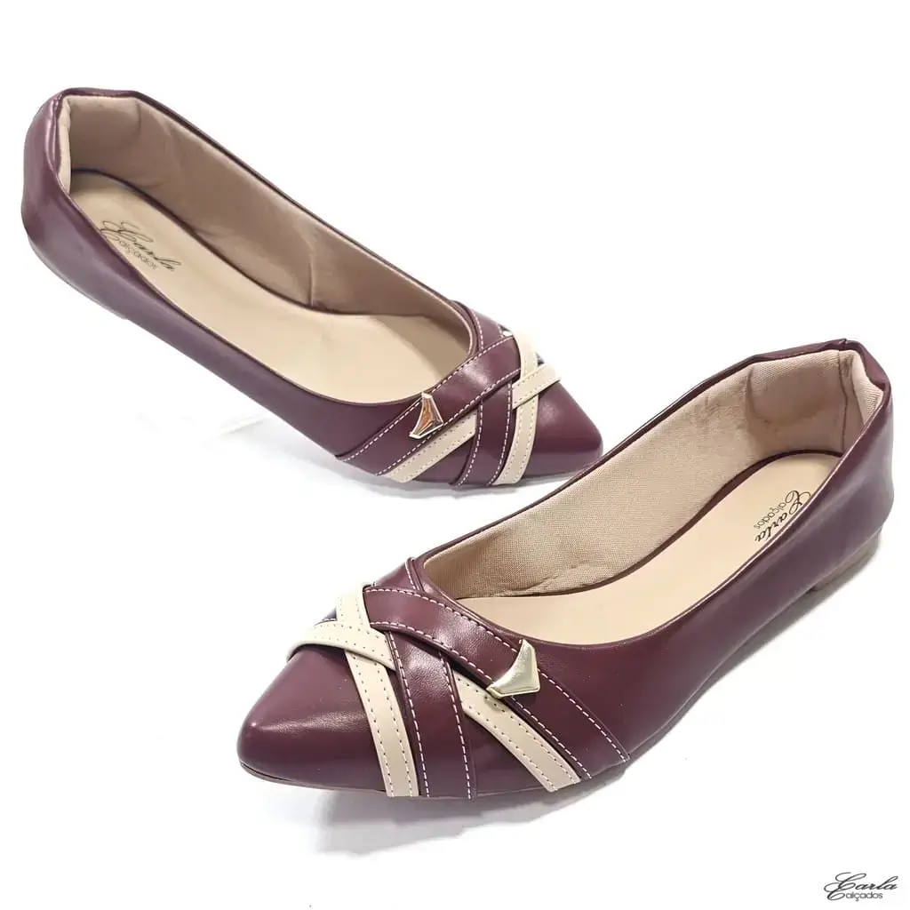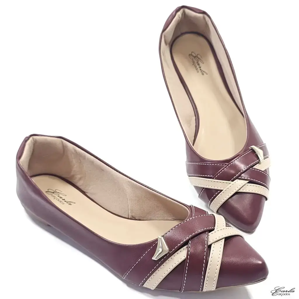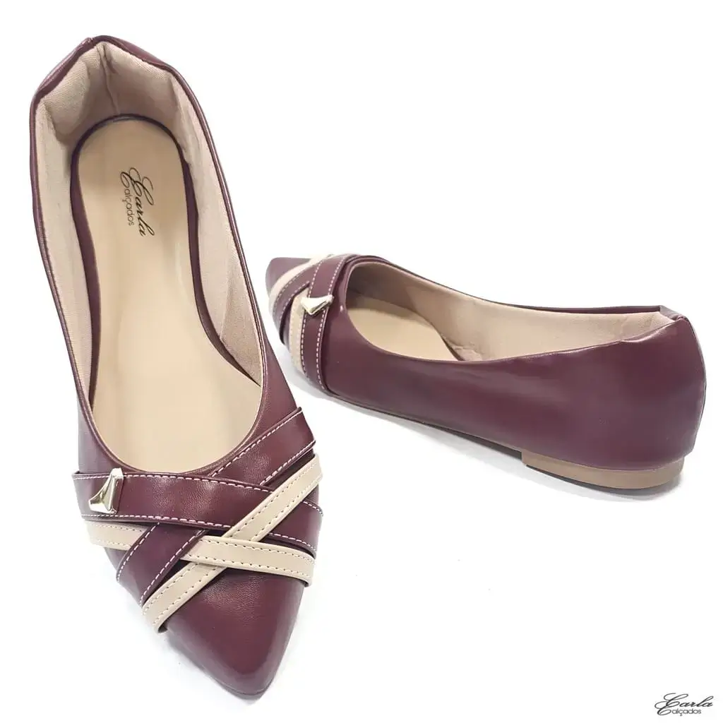 Essa sapatilha marsala com tiras em marsala e nude é puro encanto! O contraste de cores dá um toque moderno e delicado, enquanto o bico fino deixa o visual mais alongado e elegante — perfeito para quem ama compor looks com personalidade.