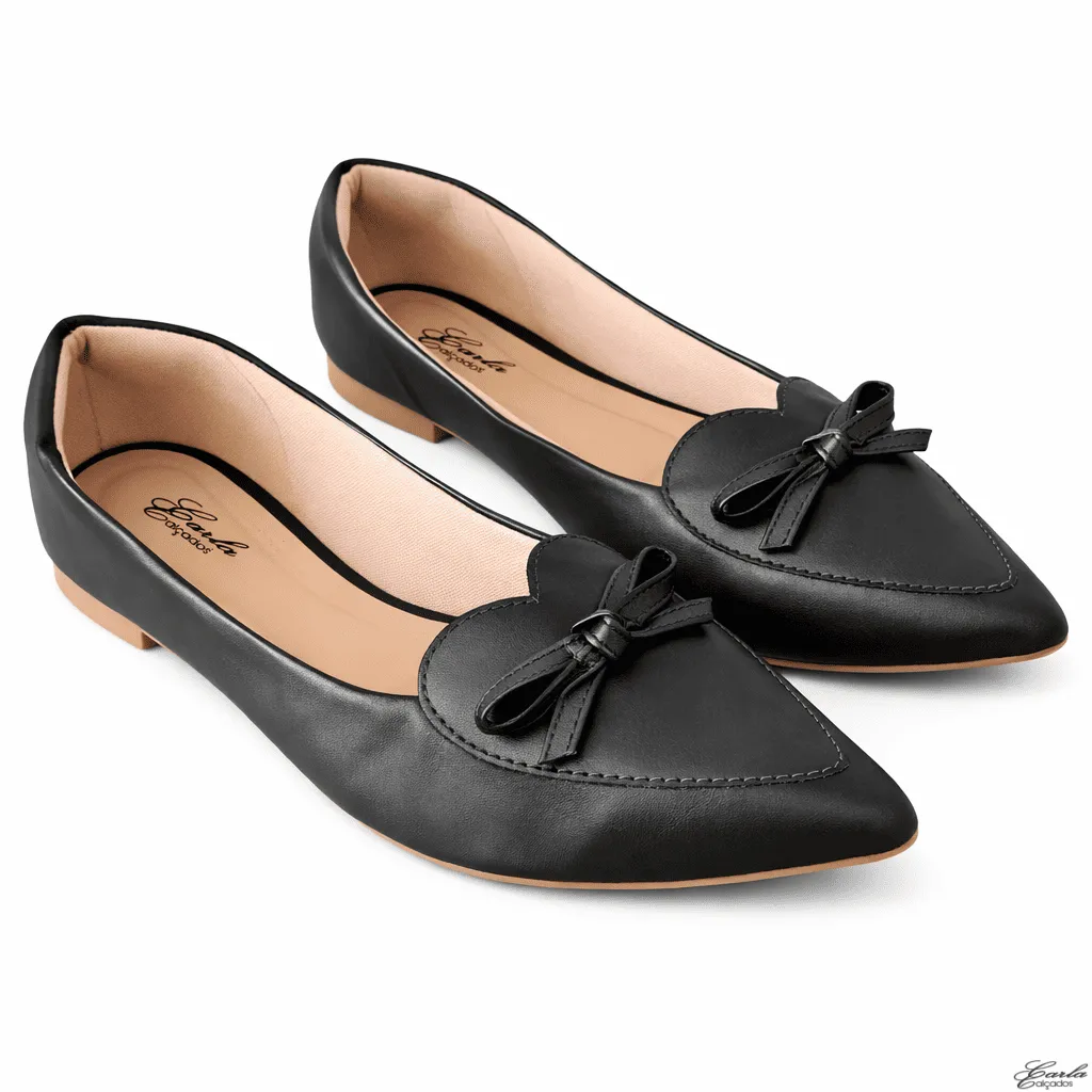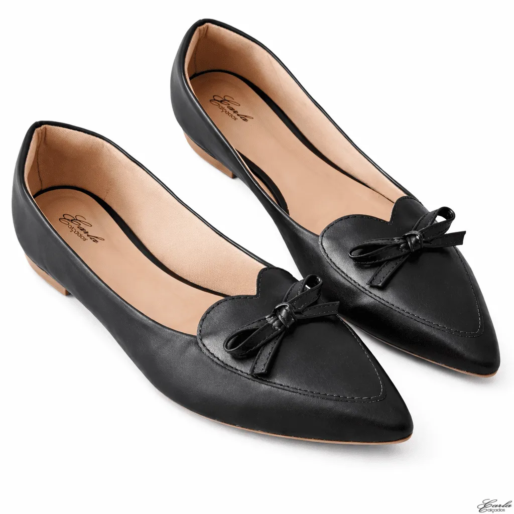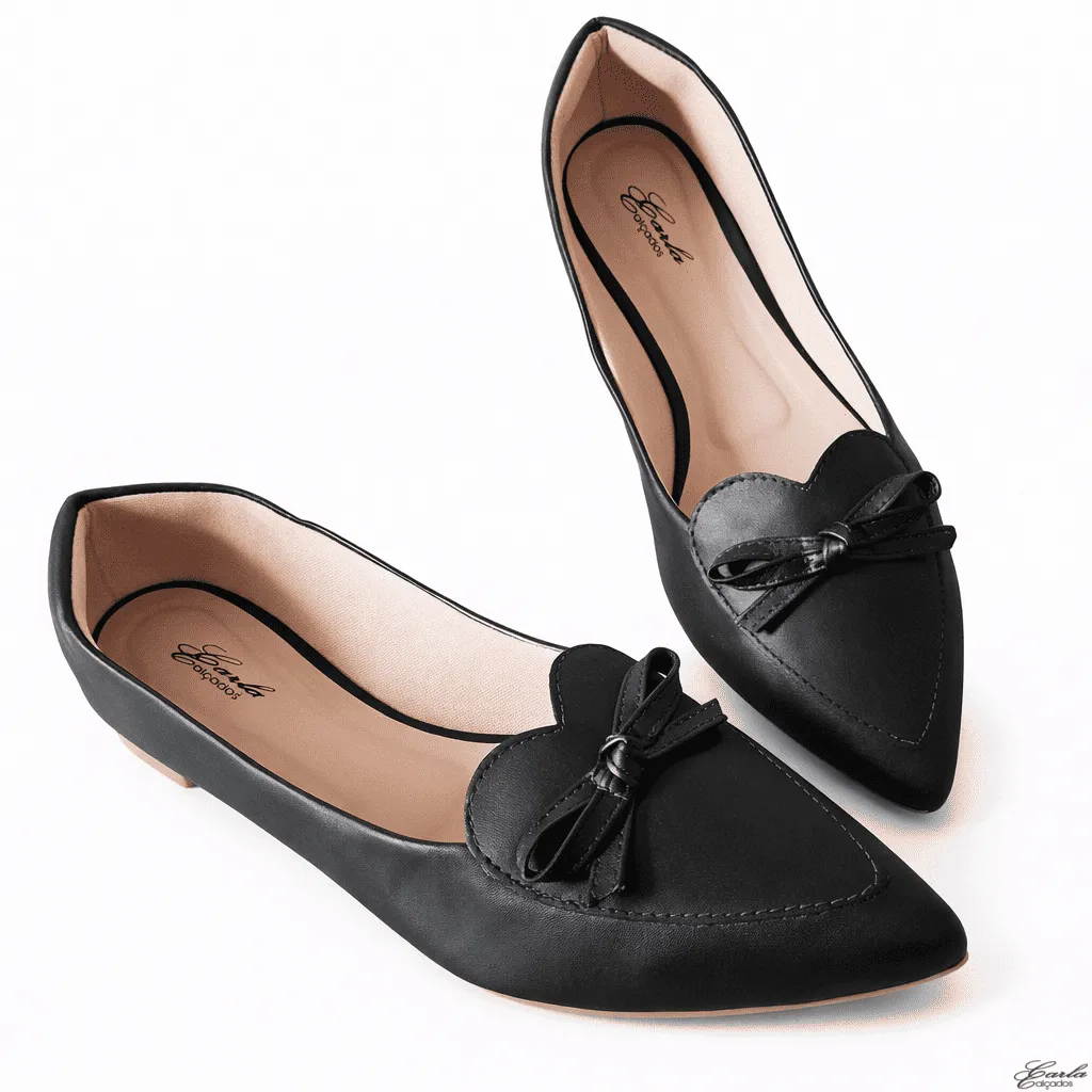Delicada, elegante e cheia de charme, a Sapatilha Numeração Especial Coração Laço Bico Fino Preta 41 ao 44 traz um design feminino e diferenciado para o dia a dia.