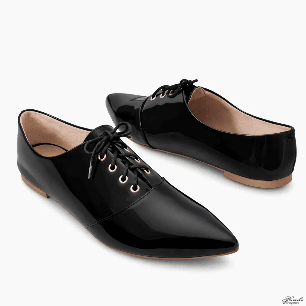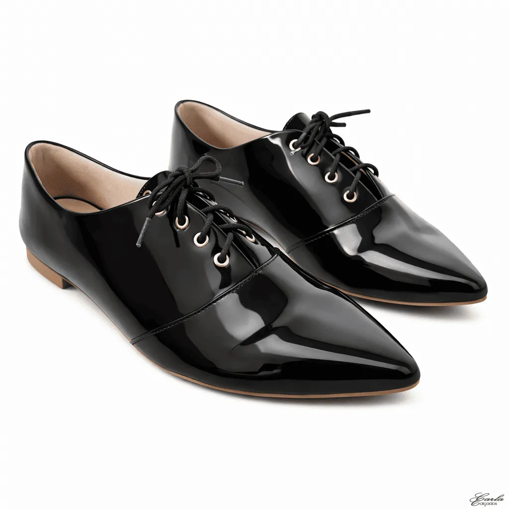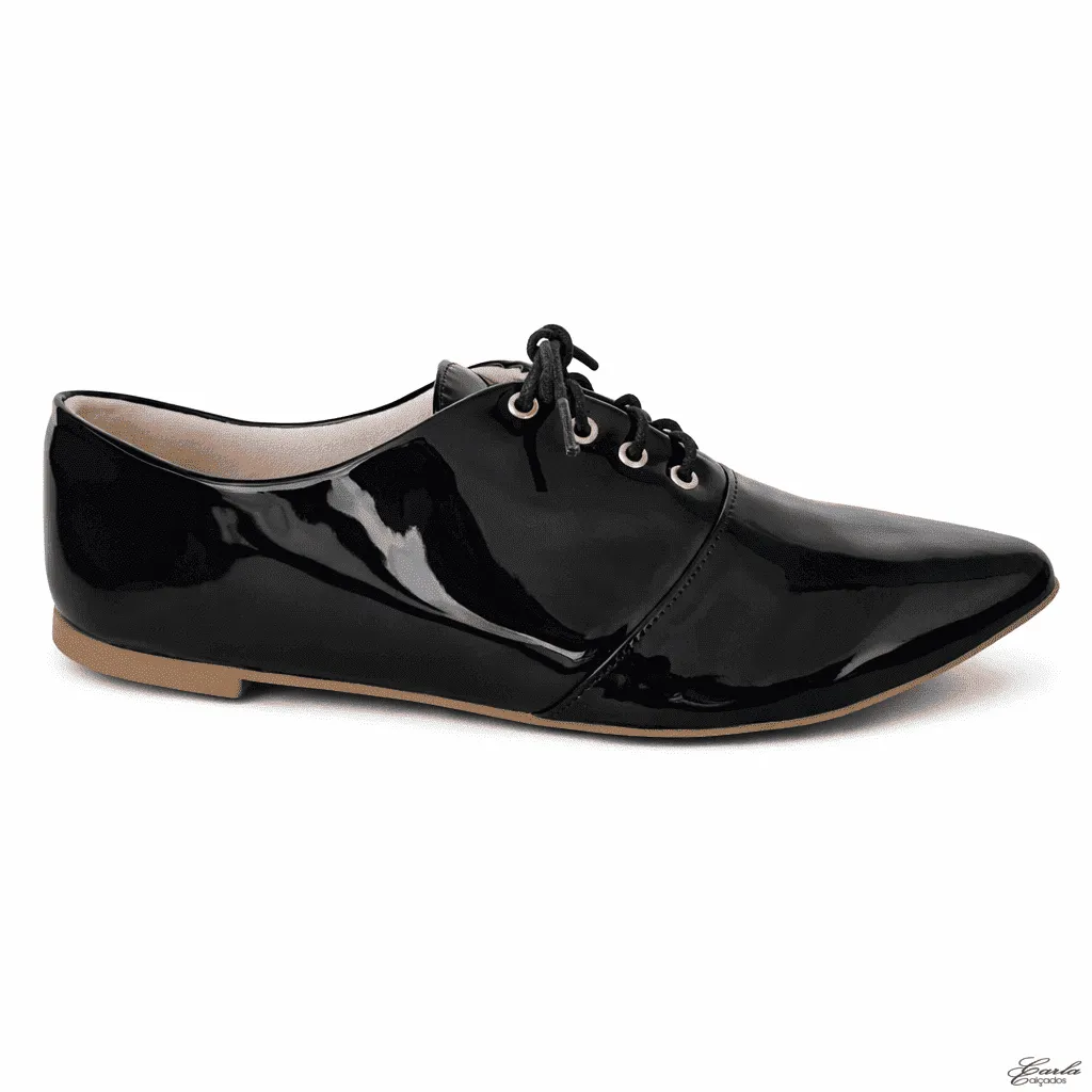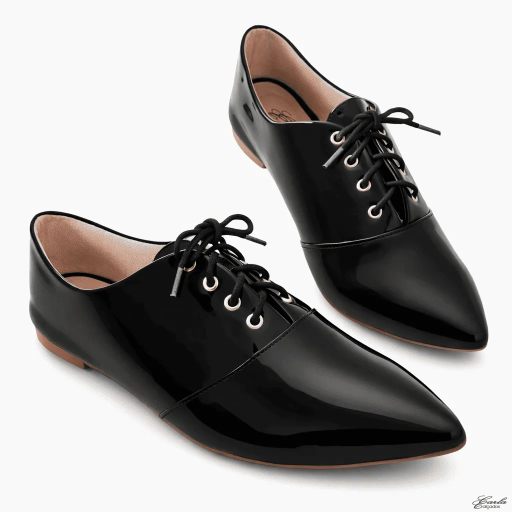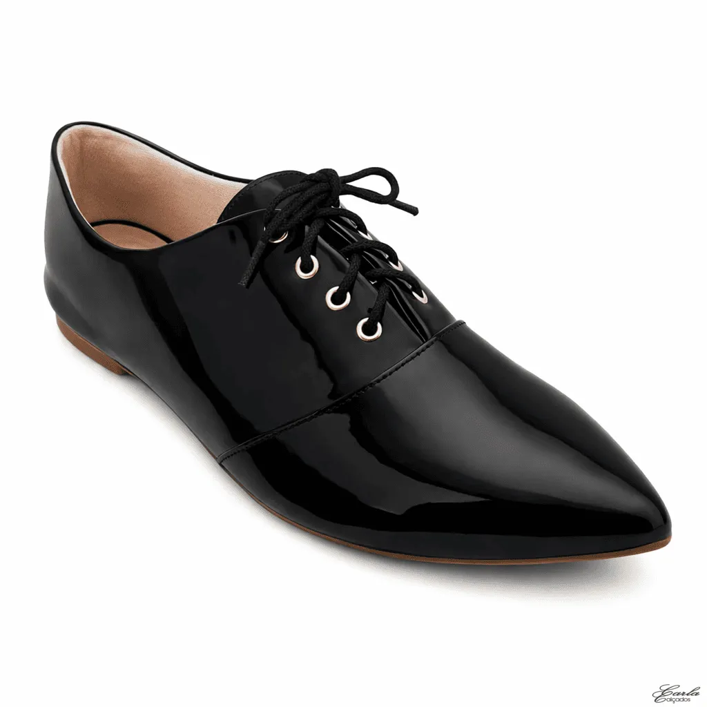 O modelo apresenta o clássico design Oxford com bico fino e fechamento em cadarço, criando um visual refinado que valoriza qualquer produção. Além disso, o acabamento em verniz preto traz brilho na medida certa, tornando o calçado ainda mais elegante e marcante.