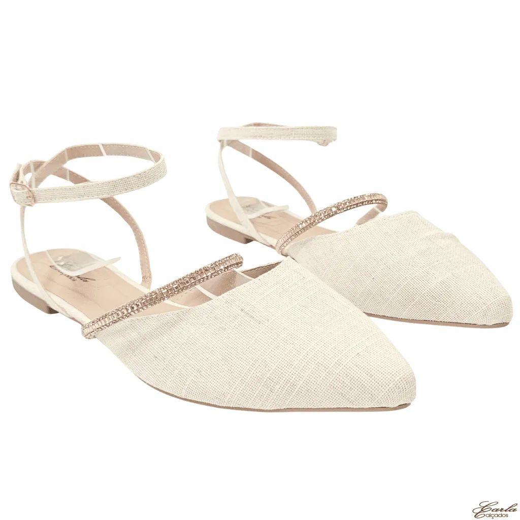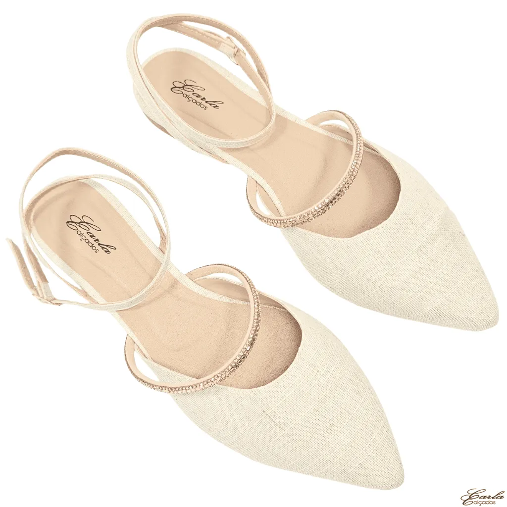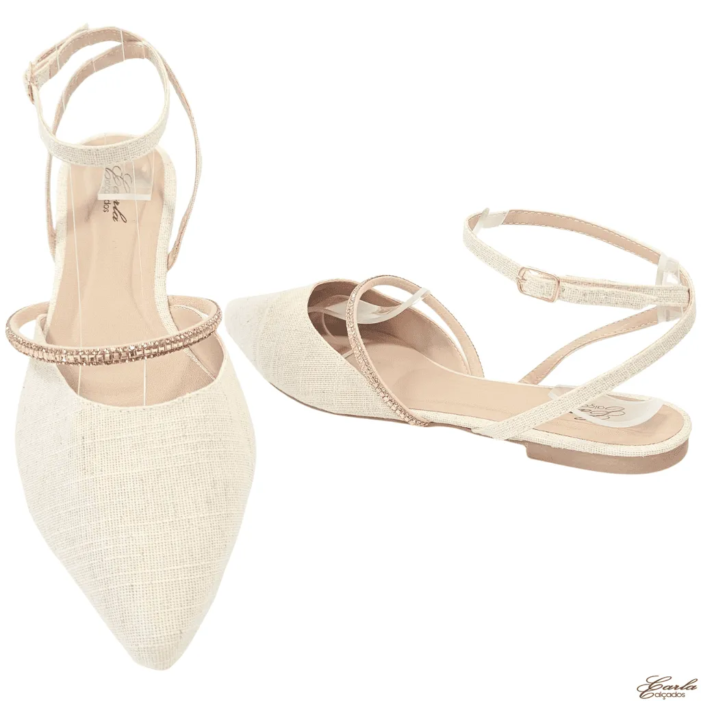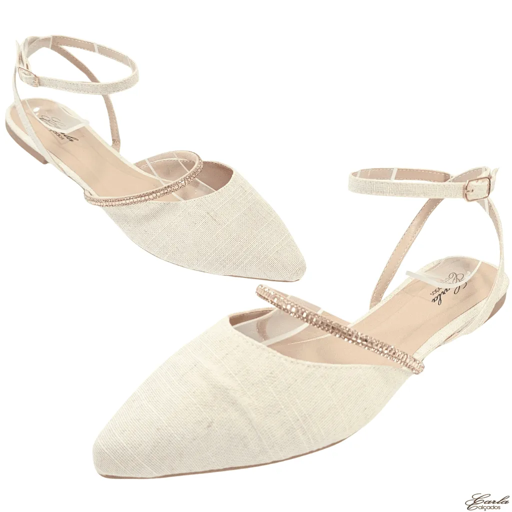 A tira com pedrarias em tom rosê adiciona um brilho sofisticado e feminino, enquanto a fivela regulável garante ajuste perfeito. O bico fino confere delicadeza ao visual e a sola de borracha oferece conforto e estabilidade, tornando-a ideal para o dia a dia ou momentos especiais.