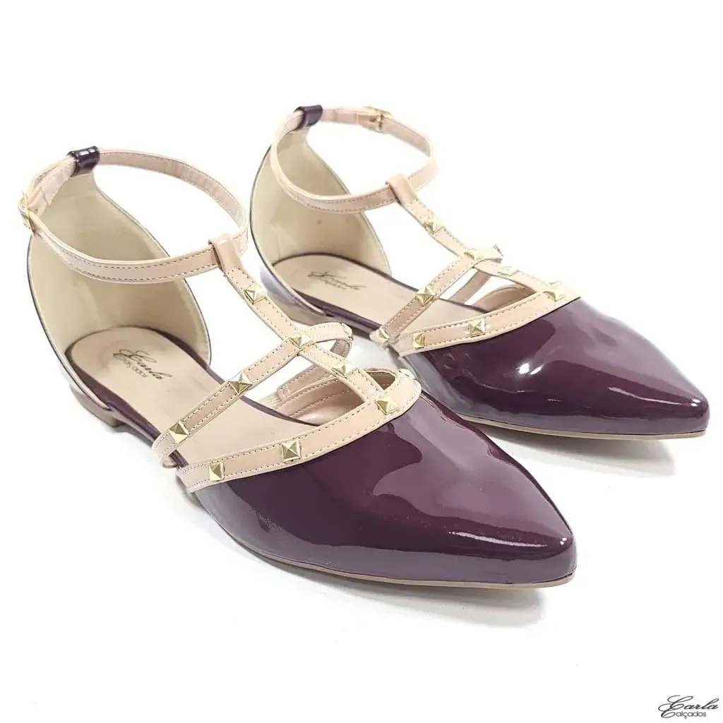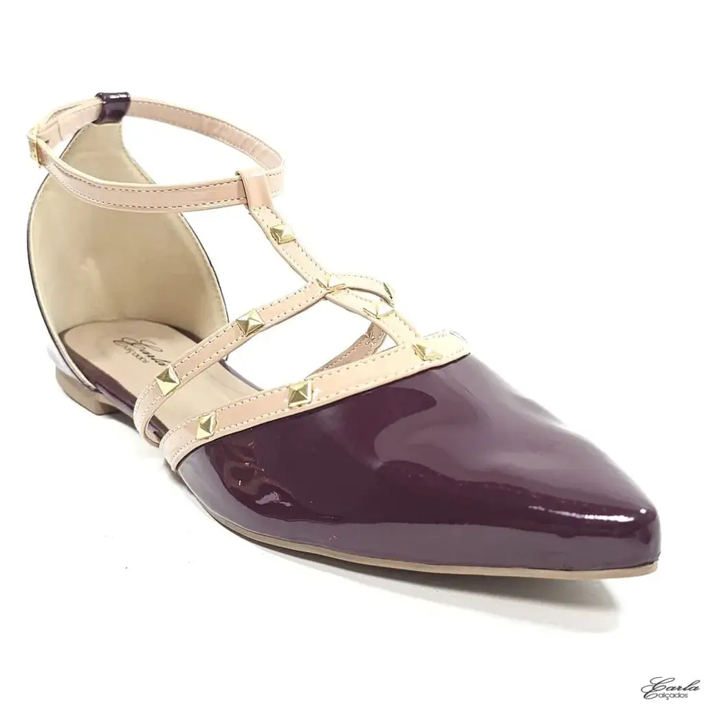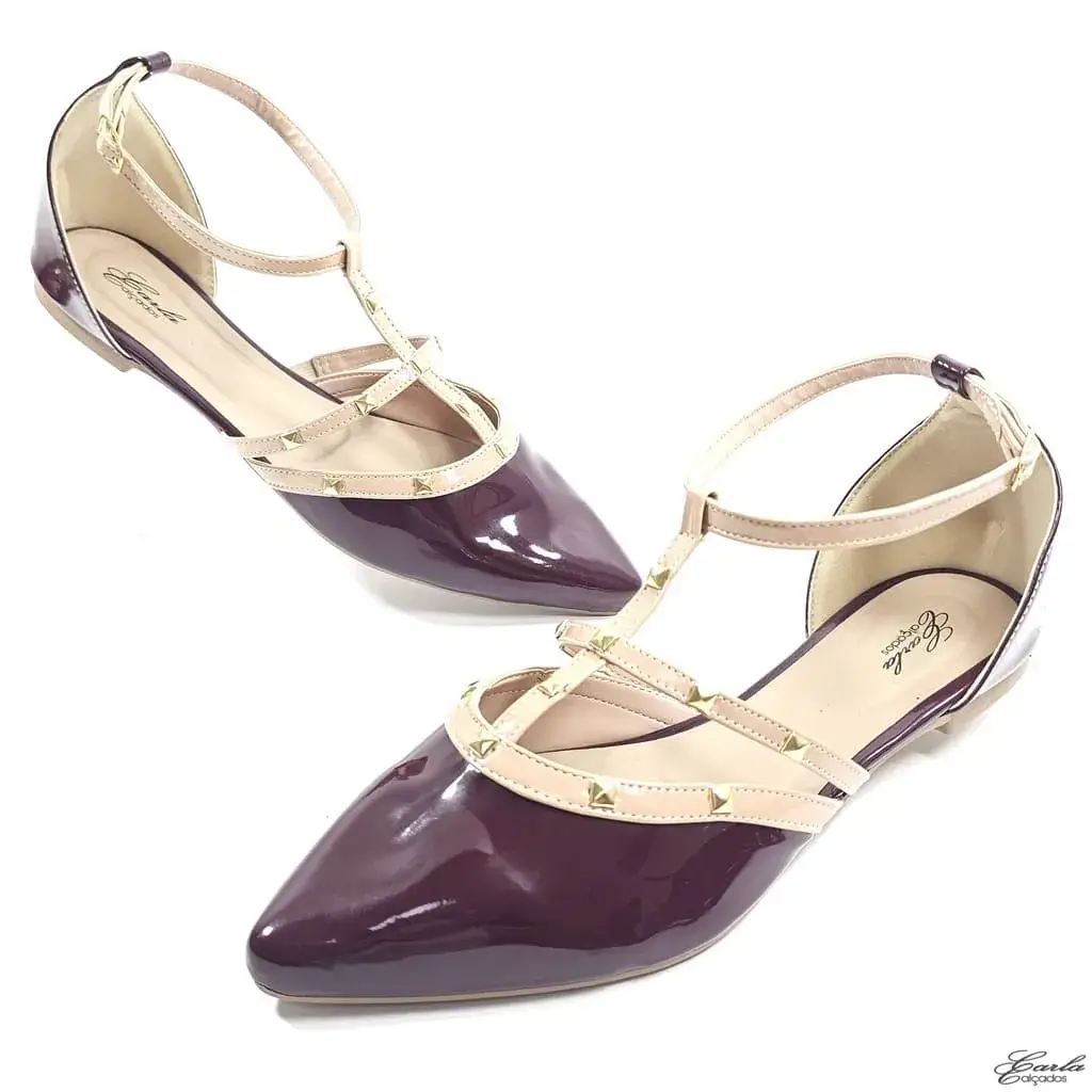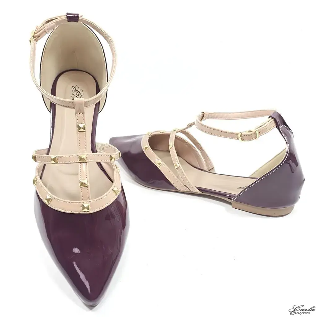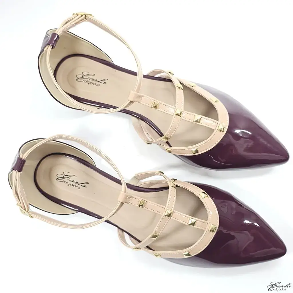 Confeccionada em verniz marsala com detalhe nude, ela traz aplicações de spikes dourados, que adicionam um toque fashion e ousado na medida certa. Além disso, o bico fino garante elegância, enquanto a fivela regulável proporciona ajuste perfeito e conforto durante todo o dia.