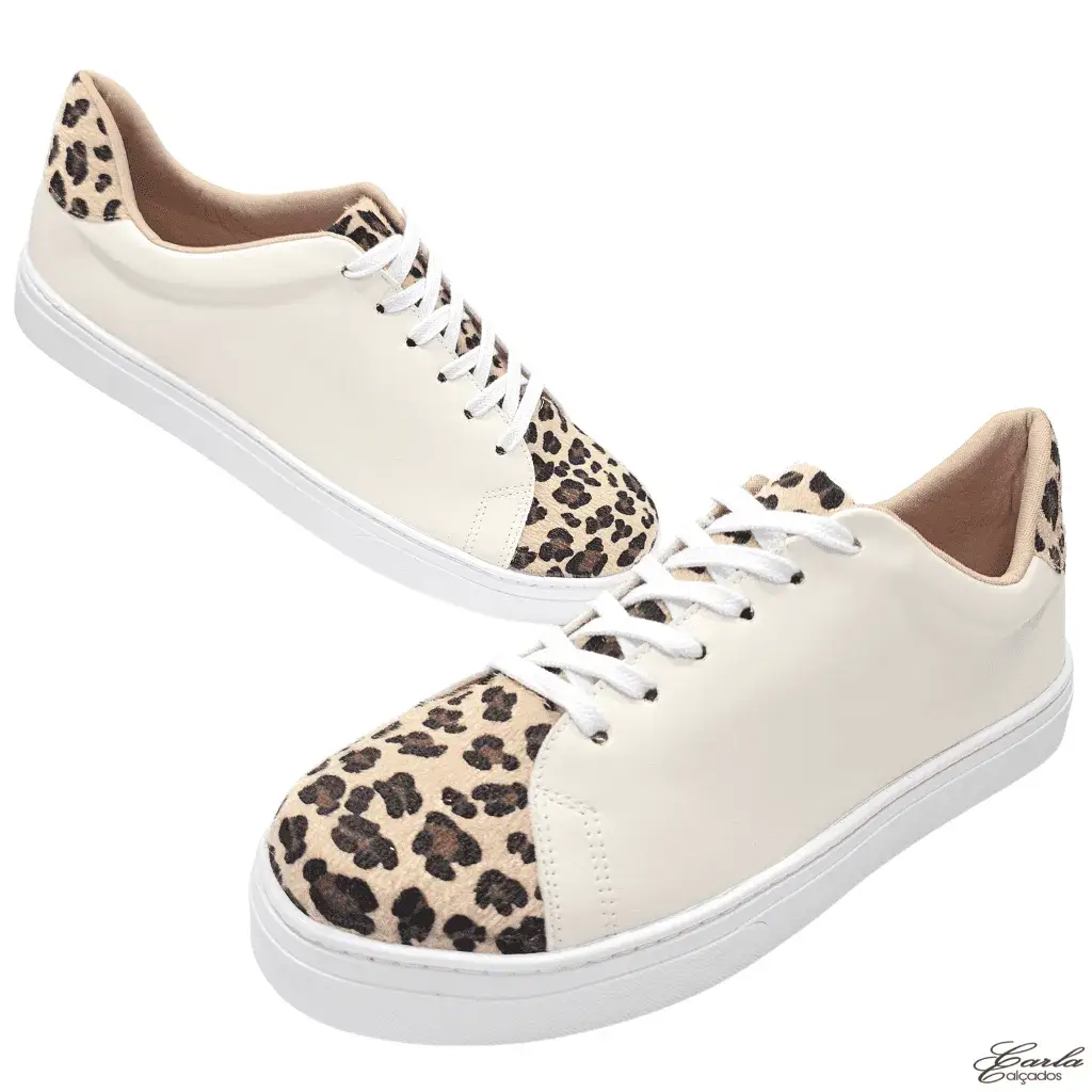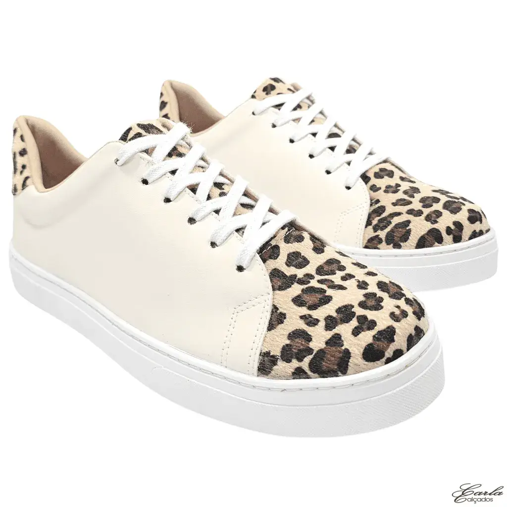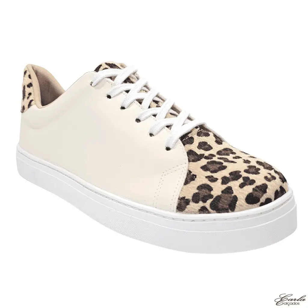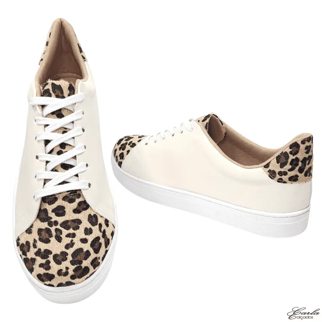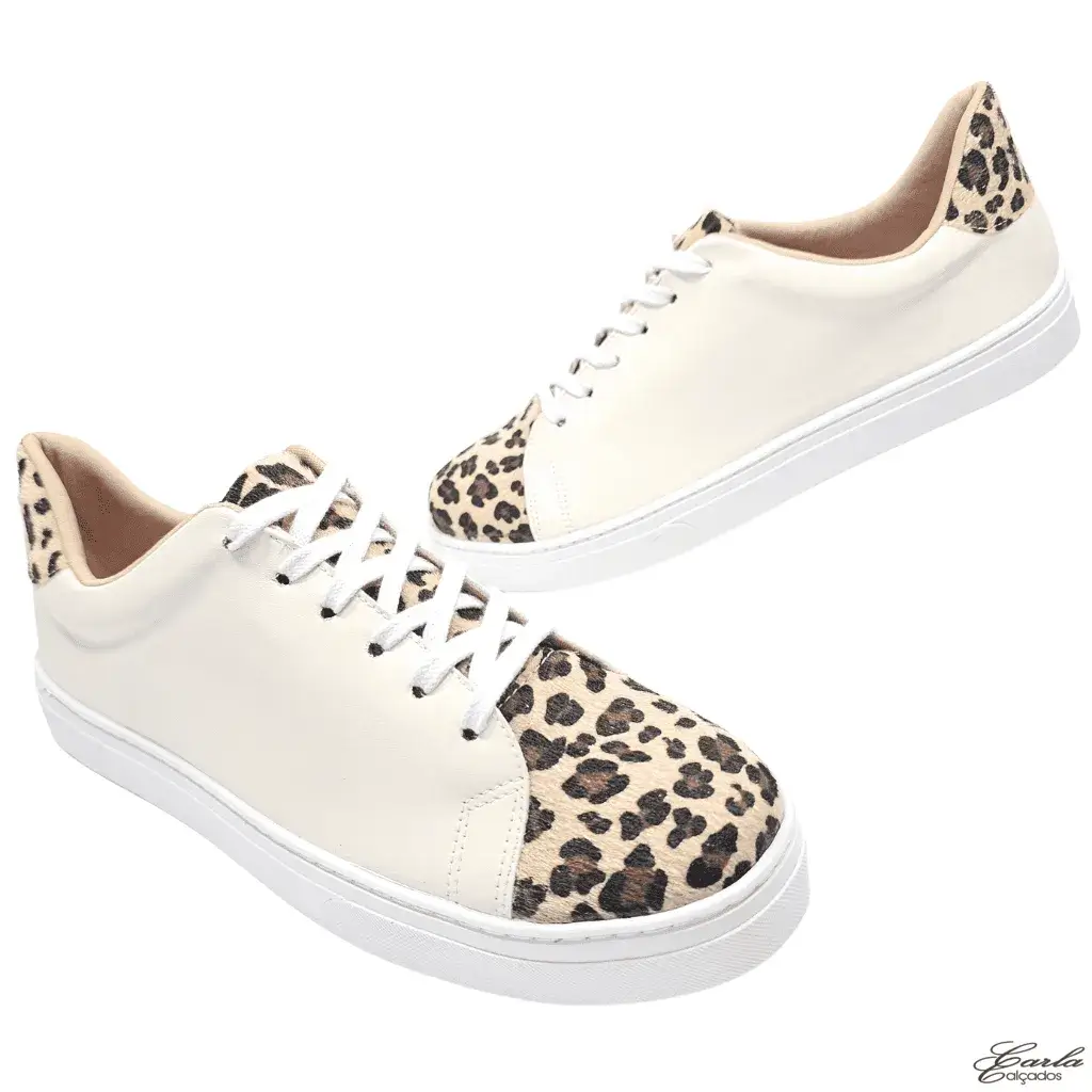 O básico ganhou vida com um toque de ousadia! Este tênis casual branco Carla Calçados une a elegância do branco neve ao charme da estampa animal print onça no detalhe traseiro.
